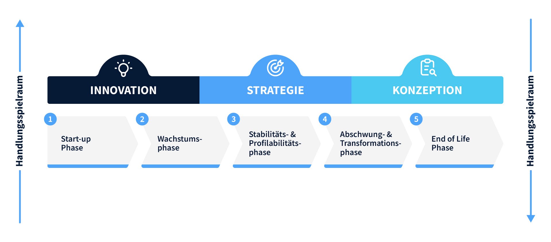 - Abschwung- & Transformationsphase: Sollte Ihr Unternehmen in eine schwierige Phase geraten, unterstützen wir Sie bei der Transformation und Neuausrichtung, um wieder auf Erfolgskurs zu kommen.
